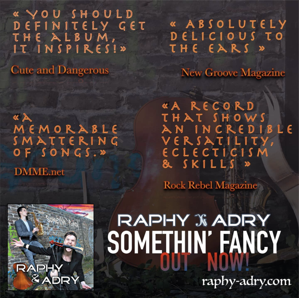 Mit der außergewöhnlichen Zusammensetzung aus Cello und Saxophon spielen die beiden Brüder ein Crossover-Repertoire. Ob Rock, Jazz, Klassik oder Folk, Raphy & Adry lassen nichts aus und spielen eigene sowie arrangierte Songs. Als klassisch ausgebildete Musiker, gehen sie über die Grenzen ihrer Instrumente hinaus und erschaffen dadurch ganz außergewöhnliche und ungewohnte Klangfarben.